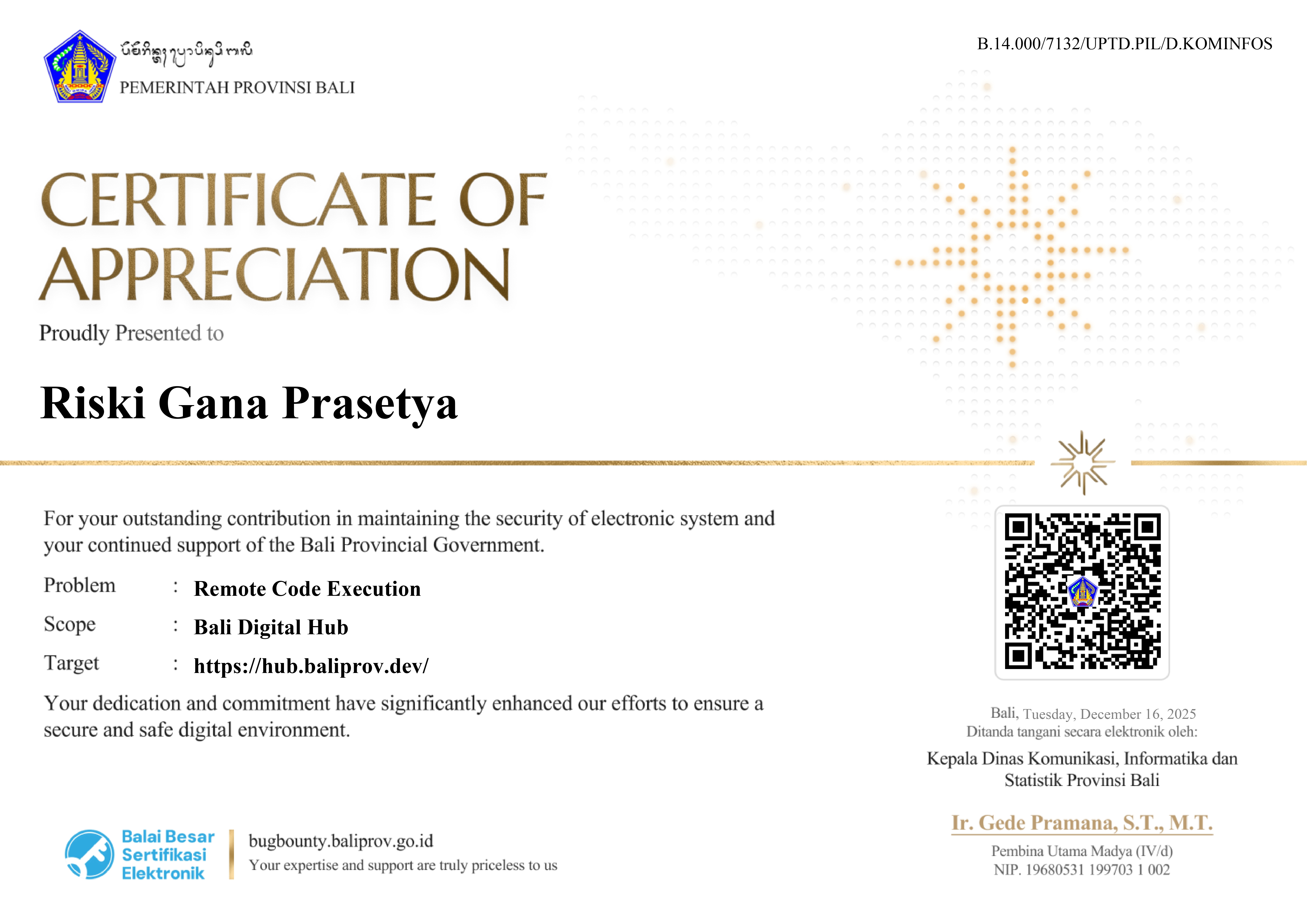 Recognized for identifying and responsibly disclosing a newly discovered security vulnerability on the Cimahi City Government’s systems.
