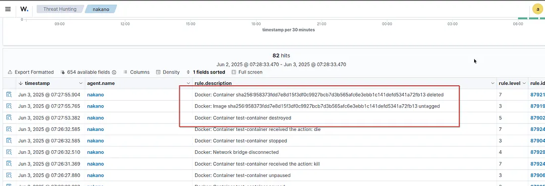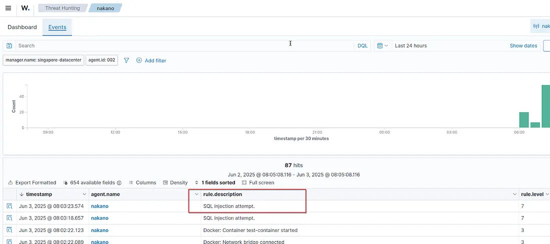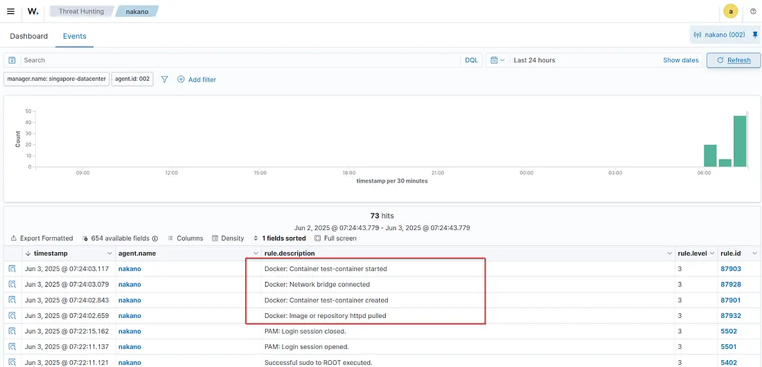 Hasil monitoring dapat kita lihat pada Wazuh dashboard di module Threat Hunting atau Docker listener dashboard.