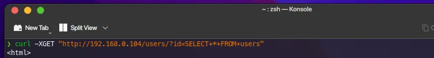 curl -XGET "http://<WEB_IP_ADDRESS>/users/?id=SELECT+*+FROM+users"