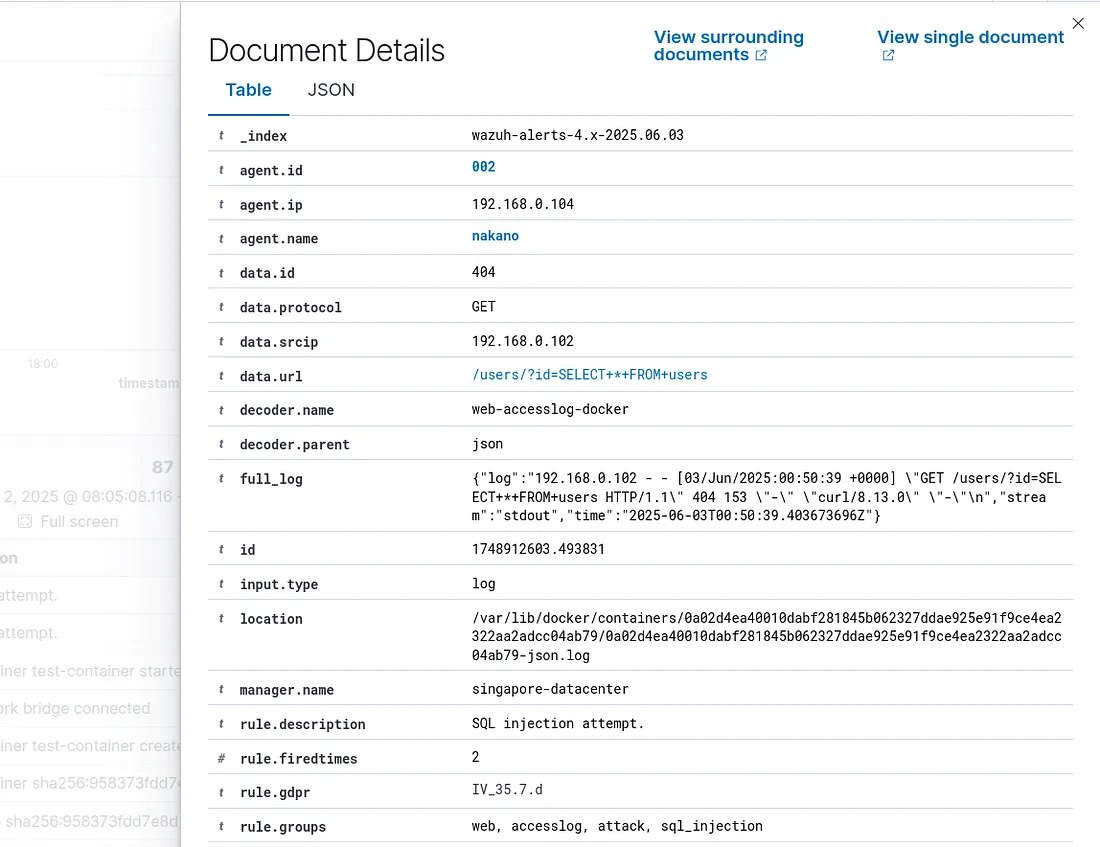 Alert akan muncul pada Wazuh Dashboard dengan detail lengkap mengenai serangan SQL Injection yang terdeteksi: