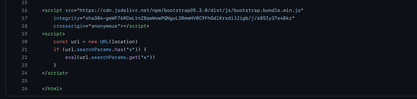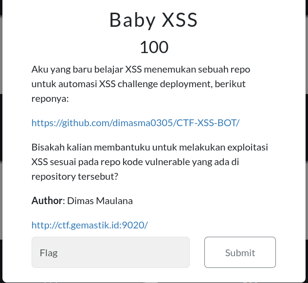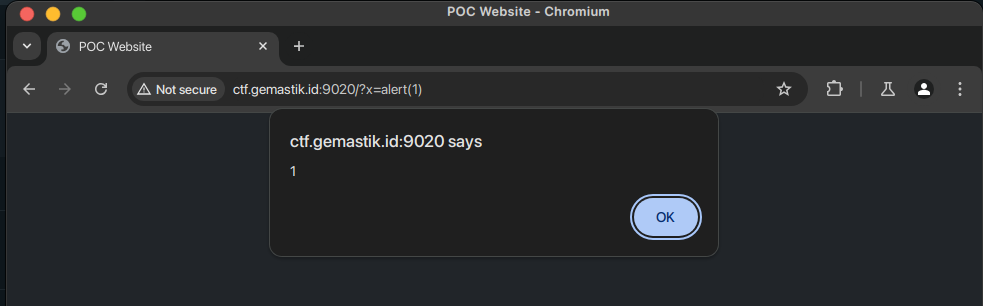 Sesuai dengan deskripsi challenge, ini merupakan challenge XSS (Cross-Site Scripting). Berdasarkan repository yang diberikan, vulnerability XSS terdapat pada halaman utama yaitu http://ctf.gemastik.id:9020/ dengan parameter x pada URL.