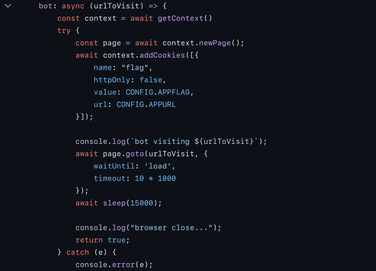 Dari kode bot yang tersedia di repository, terlihat bahwa flag dimasukkan ke dalam cookie pada browser bot.