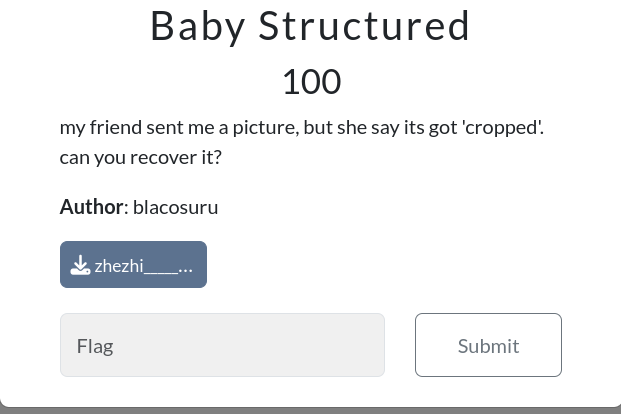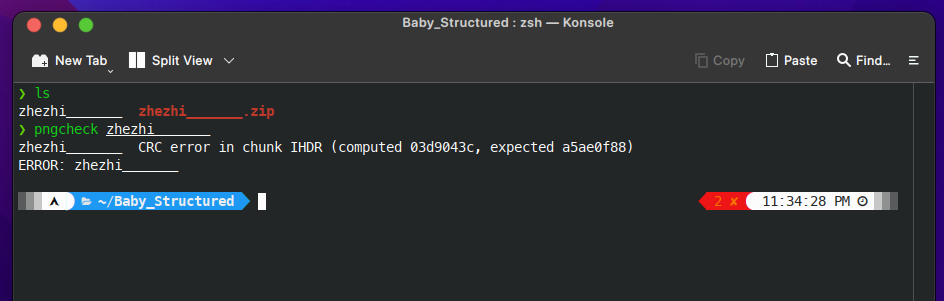 Dari challenge ini kami diberikan sebuah file ZIP, dan ketika diekstrak terdapat sebuah gambar berformat PNG yang tidak dapat dibuka. Error ini disebabkan karena terdapat ketidakcocokan antara ukuran gambar (image size) dengan CRC checksum pada struktur PNG.